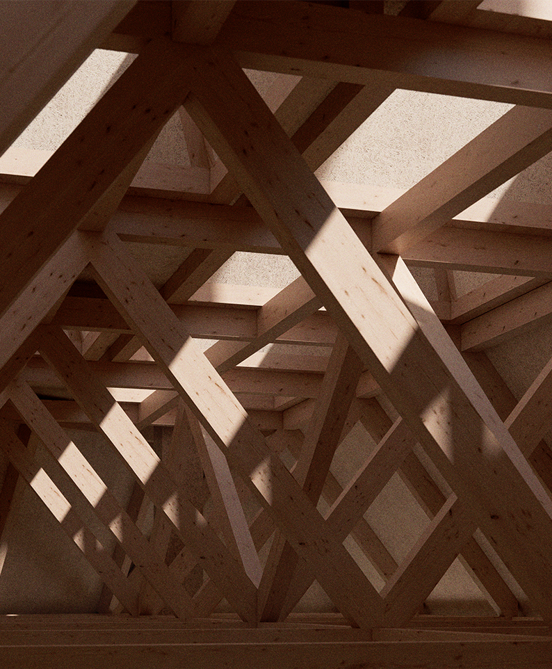Konstruktionen i Porticus er tænkt som husets egentlige struktur, et tydeligt, ærligt og rytmisk skelet, der giver rummet sin karakter. Taget skal have vægt og dimension, ikke som noget tungt, men som en rolig horisont over den store kantine og samlingssal. Strukturen er derfor udviklet som en rumgitterkonstruktion i træ, der spænder søjlefrit over hallens bredde og danner et stærkt, men poetisk skelet i rummet.