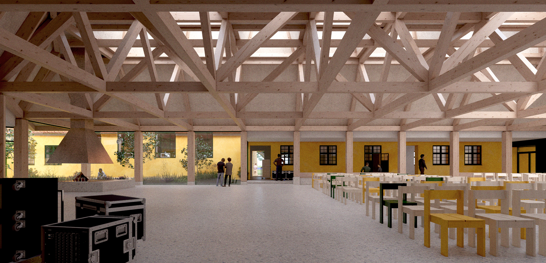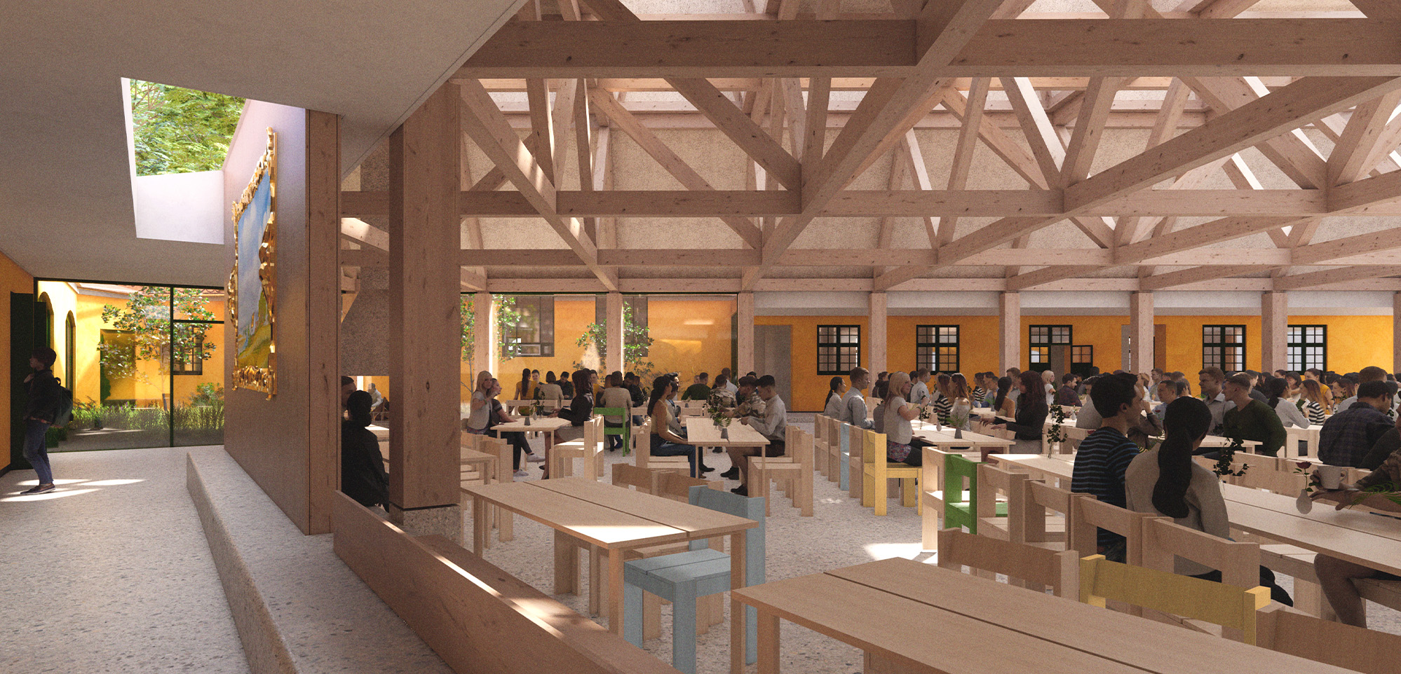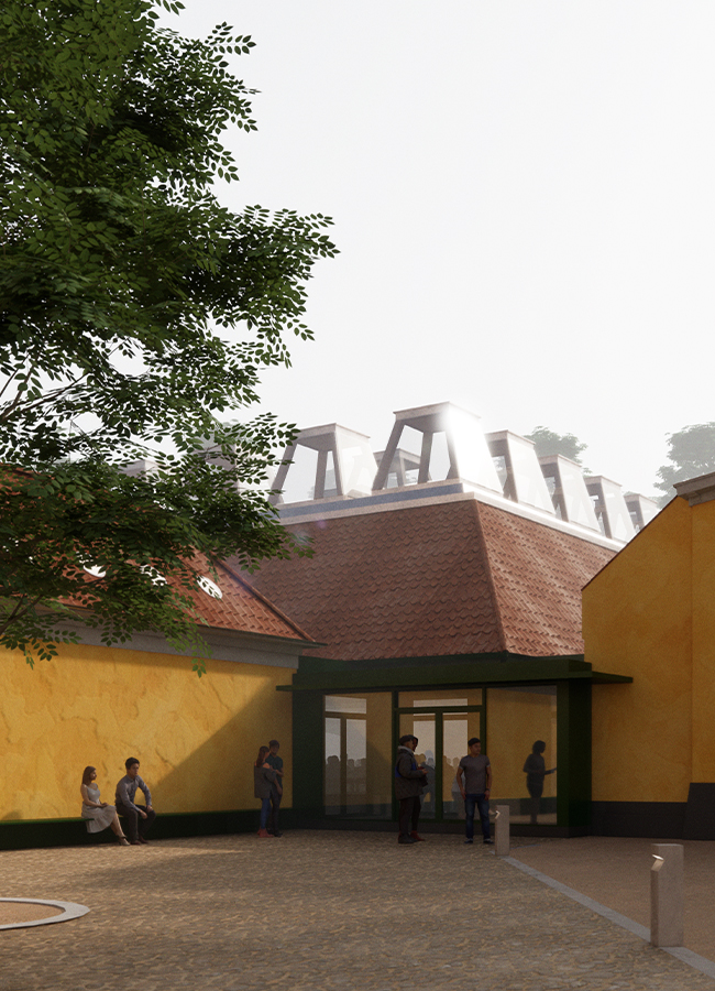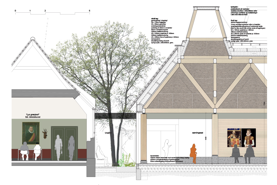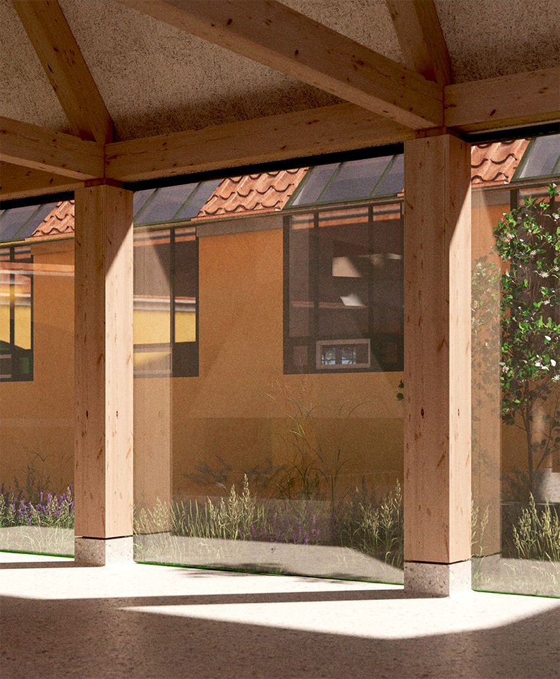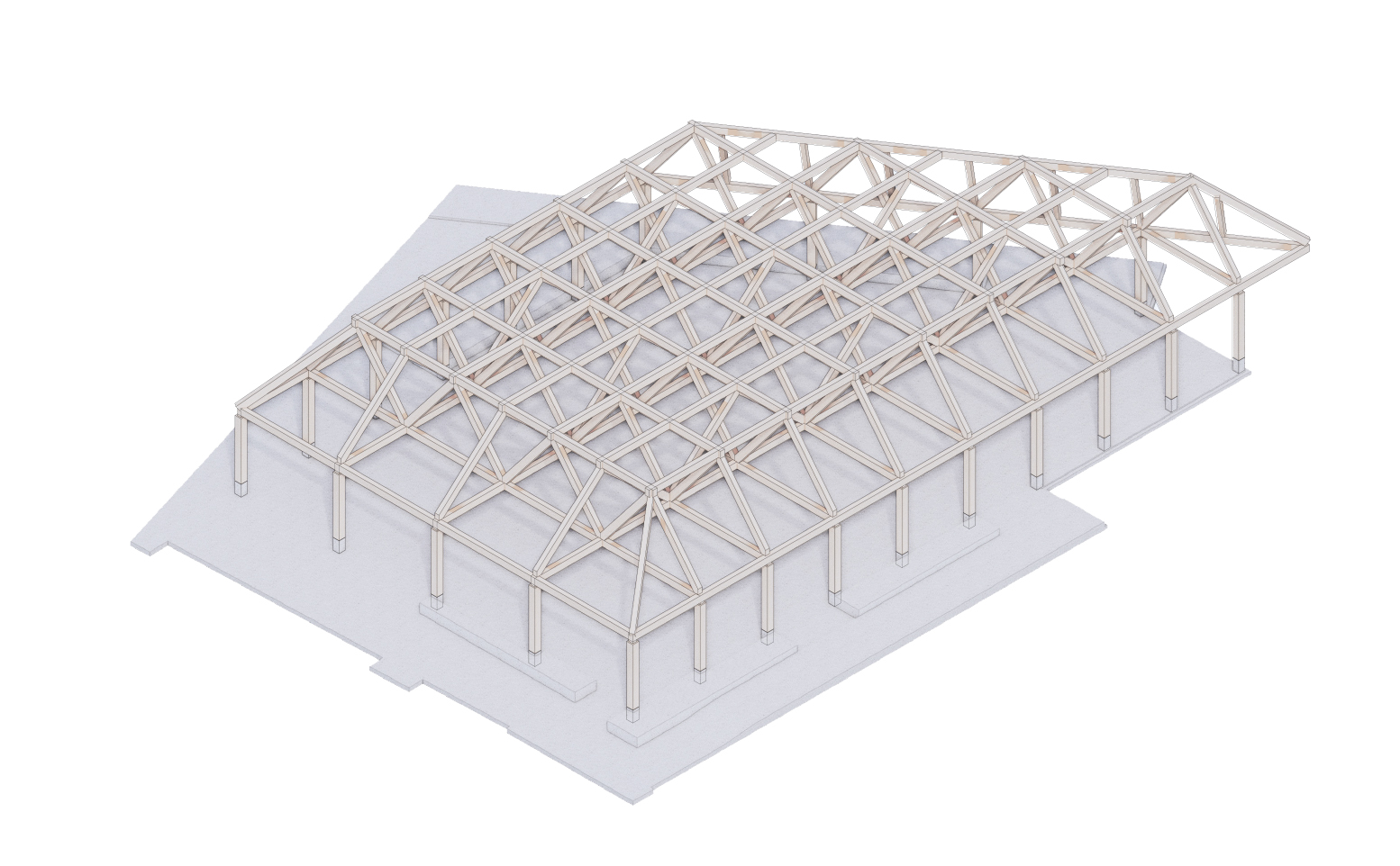 Konstruktionen i Porticus er tænkt som husets egentlige struktur, et tydeligt, ærligt og rytmisk skelet, der giver rummet sin karakter. Taget skal have vægt og dimension, ikke som noget tungt, men som en rolig horisont over den store kantine og samlingssal. Strukturen er derfor udviklet som en rumgitterkonstruktion i træ, der spænder søjlefrit over hallens bredde og danner et stærkt, men poetisk skelet i rummet. I kontrast til den nye tilbygning behandles Avlsgården med nænsomhed. De eksisterende konstruktioner bevares og styrkes kun, hvor det er nødvendigt.
