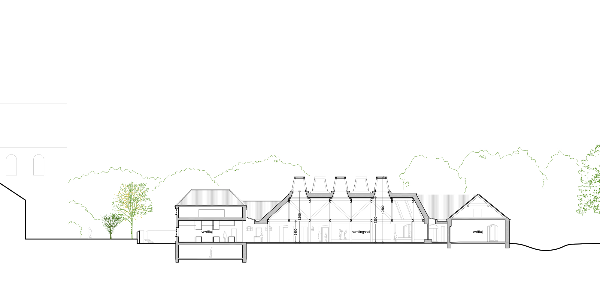 De tre lag skaber et stort fælles rum samtidig med at de i kraft af den lave spærfod og lanternerne opstår en serie mindre rum med en næsten intim karakter.